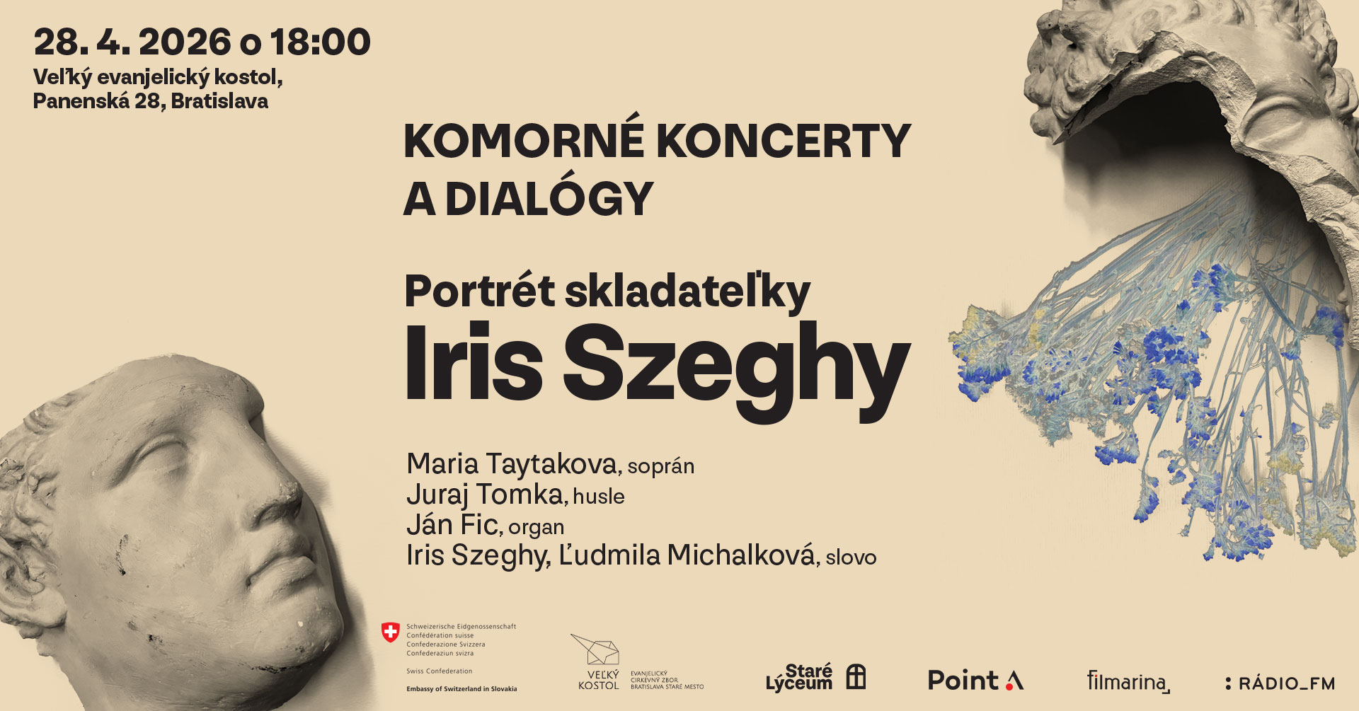 V rámci projektu Komorné koncerty a dialógy v Starom lýceu sa v utorok 28. apríla 2026 o 18.00 vo Veľkom evanjelickom kostole na Panenskej ulici v Bratislave uskutoční podujatie venované výnimočnej osobnosti slovenskej hudobnej kultúry, Iris Szeghy. Pozývame vás na stretnutie s jubilujúcou skladateľkou aj pre pozoruhodnú koincidenciu našich východísk v tom zmysle, že práve dialóg považujeme za významnú a nezastupiteľnú formu komunikácie.